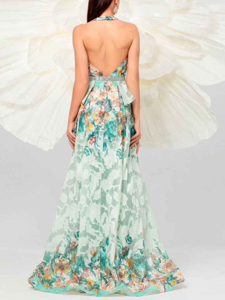 A-Line/Princess Halter Prom Dresses Split Side Floral Chiffon Floor-Length Sleeveless Formal Dresses