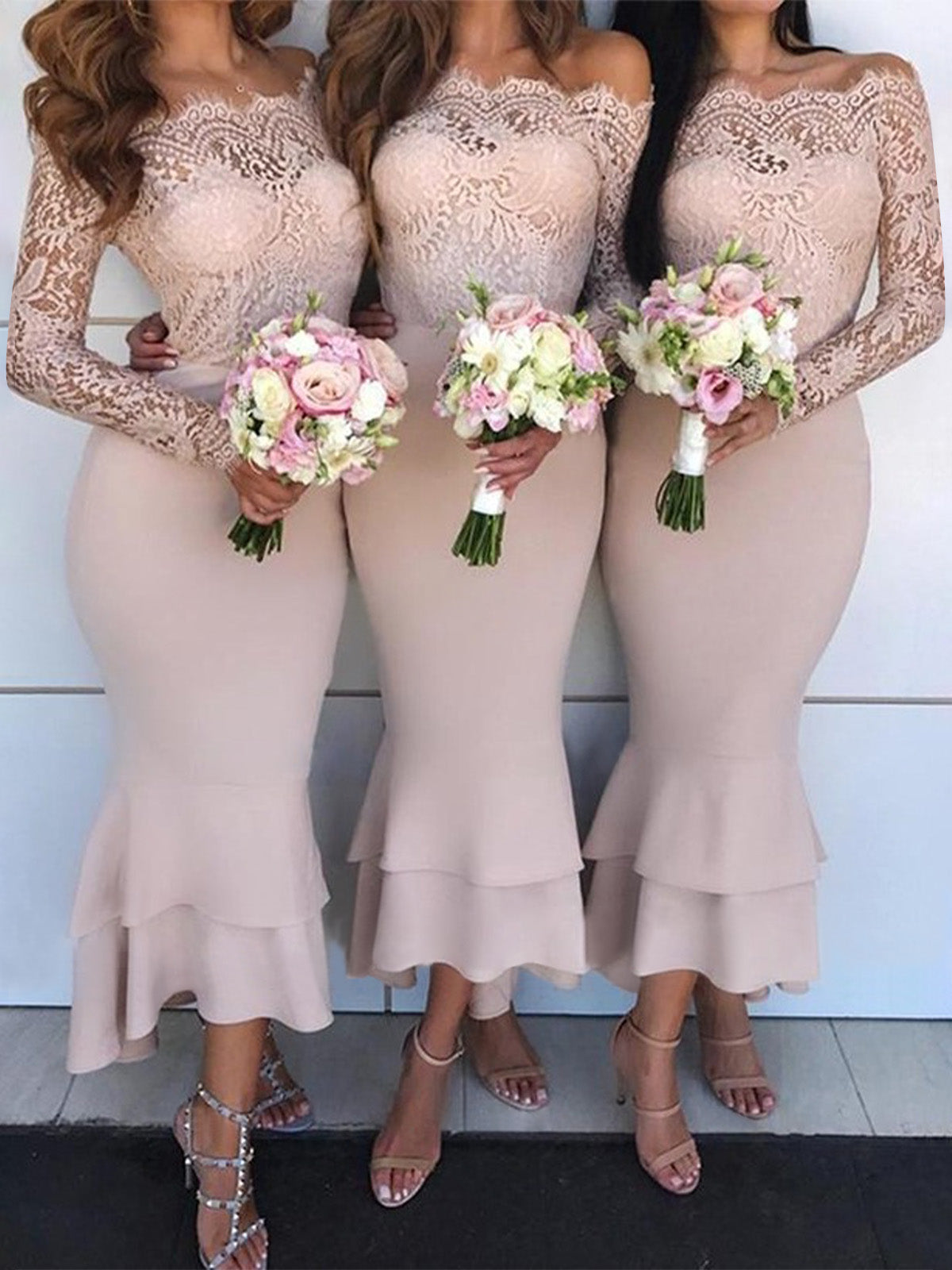 MON5412277 MONDRESSY Trumpet/Mermaid Off-the-Shoulder Long Sleeves Asymmetrical Bridesmaid Dresses with Ruffles