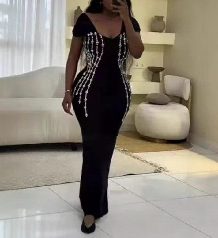 • Jewelry: Minimalist gold or pearl accents complement the dress’s clean lines.