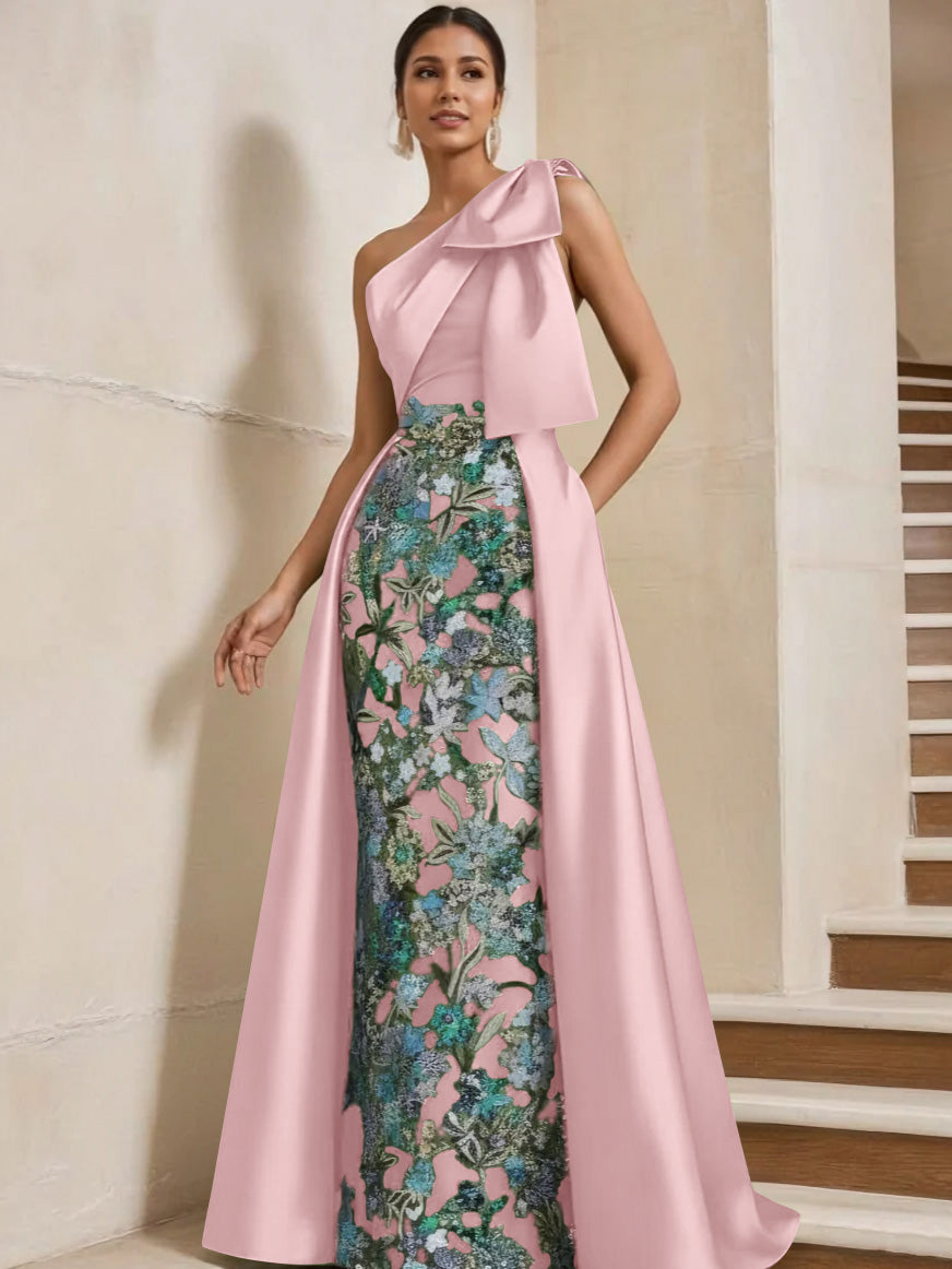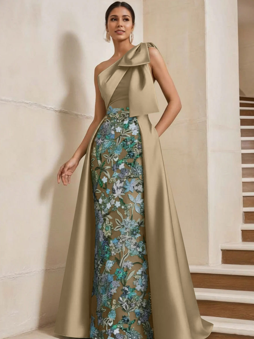 Sheath/Column One-Shoulder Satin Mother of the Bride Dresses with Overskirt Sleeveless Floor-Length Bow