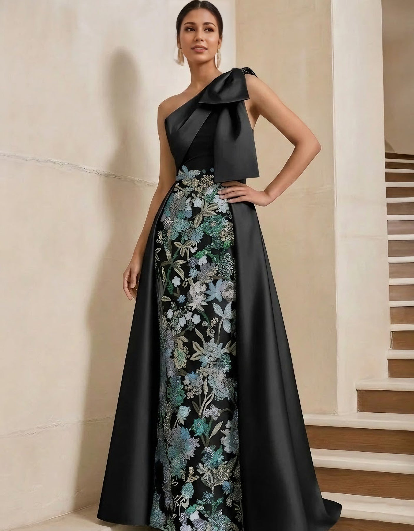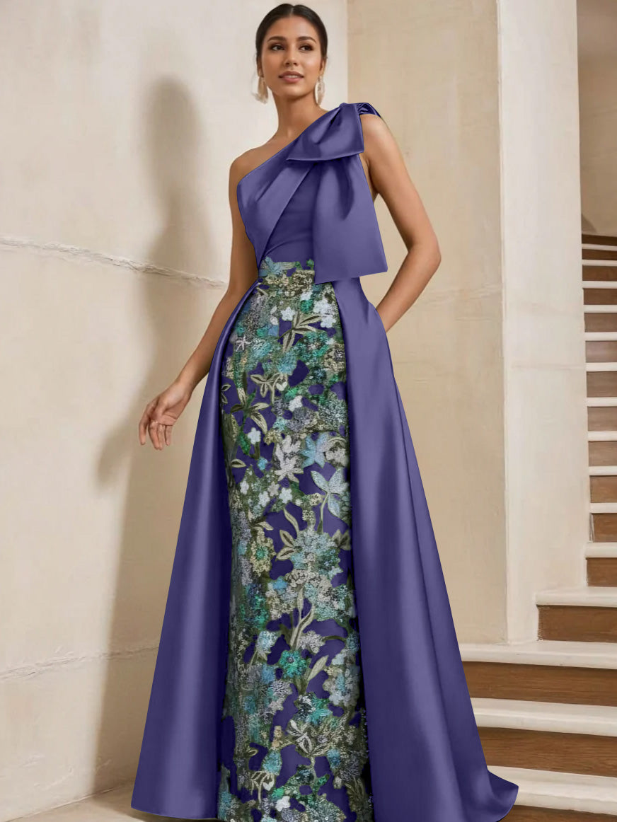 MON2312622 MONDRESSY Sheath/Column One-Shoulder Satin Mother of the Bride Dresses with Overskirt Sleeveless Floor-Length Bow