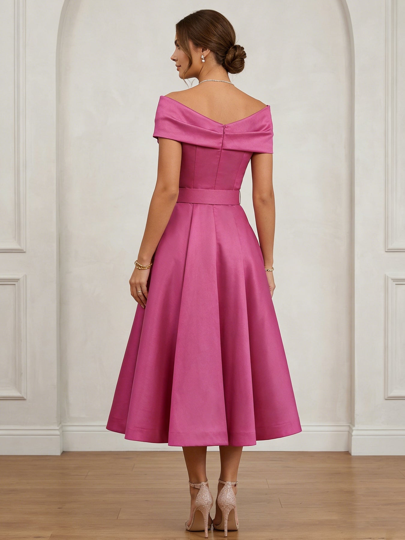 MON8040450 MONDRESSY A-Line/Princess Off-the-Shoulder Cocktail Dresses Tea-Length Sleeveless Belt Formal Dresses