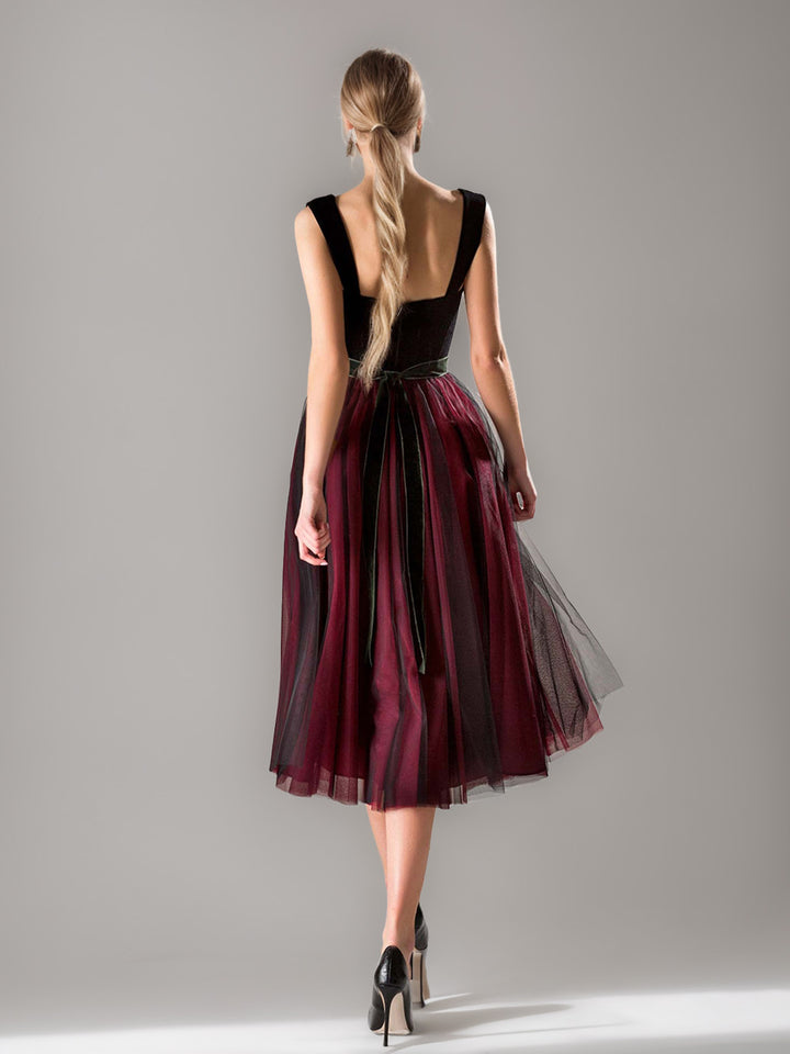 Sheath/Column Square Collar Cocktail Party Dresses Tulle Long Sleeves Little Black Dresses Tea-Length