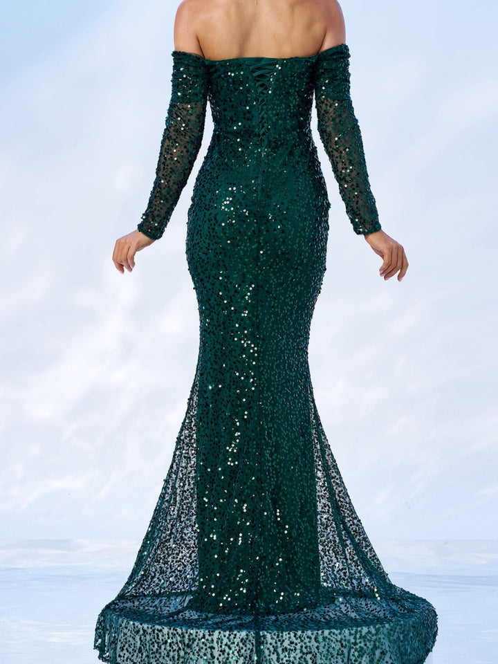 Trumpet/Mermaid Off-the-Shoulder Sequins Long Sleeves Floor-Length Evening Dresses with Pleats