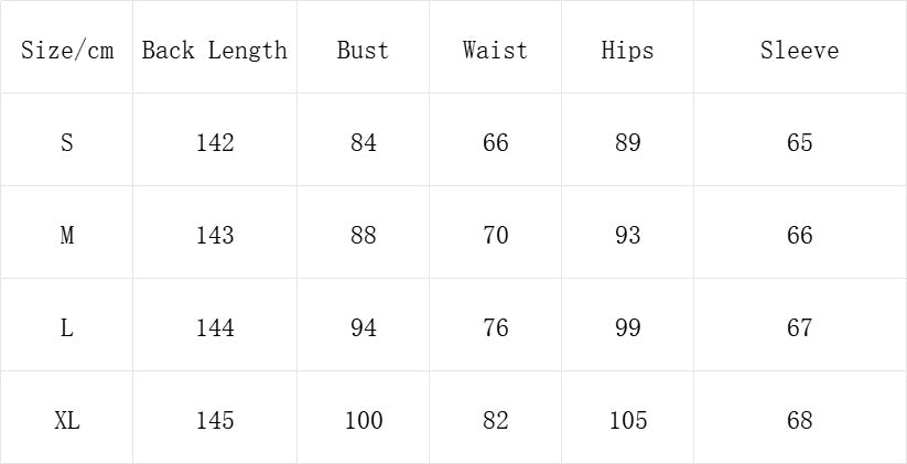 | Size/cm | Back Length | Bust | Waist | Hips | Sleeve |