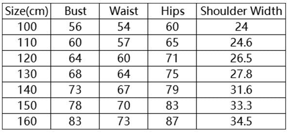 Size(cm) Bust Waist Hips Shoulder Width 100 56 54 60 24 110 60 57 65 24.6 120 64 60 71 26.5 130 68 64 75 27.8 140 73 67 79 31.6 150 78 70 83 33.3 160 83 73 87 34.5